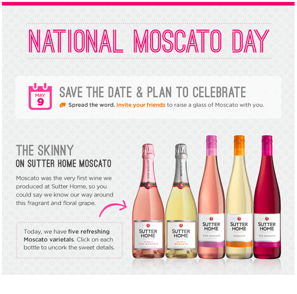 В праздник вина National Moscato Day алкогольный бренд Sutter Home выпустил приложение, позволяющее пользователям рассказать о празднике и пригласить друзей отметить его вместе.