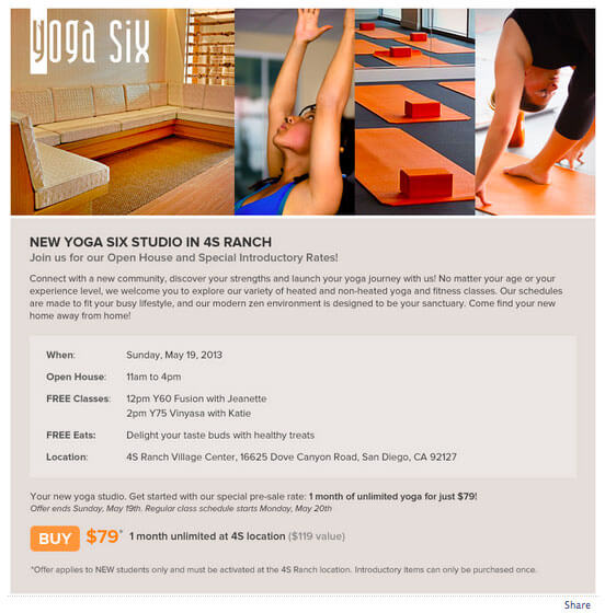 Люди думают о хорошей фигуре? Почему бы не сделать акцию в фитнес-центр. Студия йоги Yoga Six из Сан-Диего создала приложение в Facebook, нацеленное на пользователей, которые хотят заняться собой. За $79 они могут купить абонемент на месяц прямо из приложения.