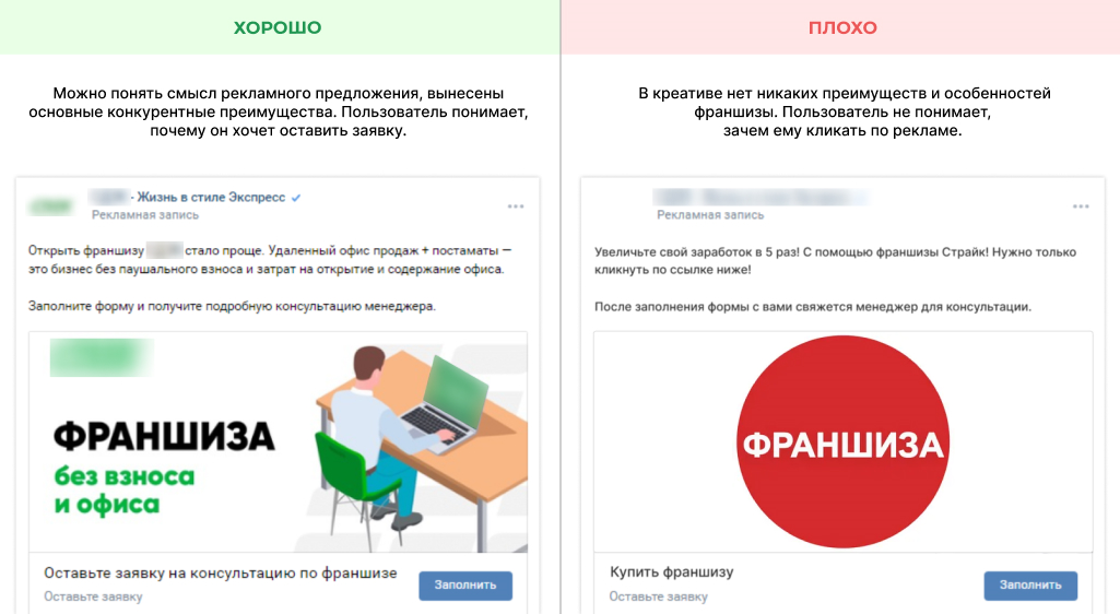 Есть одно «но» – заявки с лид-форм могут быть менее качественными, чем заявки с сайта. Дело в том, что формат лид-формы выделяет только четкие выгоды продукта, поэтому люди не всегда правильно понимают смысл предложения. На сайте же есть более подробная информация, поэтому там пользователи более осознанно оставляют заявки. Чтобы избежать такой проблемы, нужно создавать несколько вариантов креатива с лид-формой и использовать только самые выгодные и понятные преимущества франшизы – так потенциальные клиенты будут уверены, что хотят сотрудничать именно с вами.