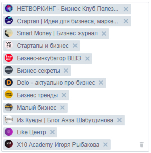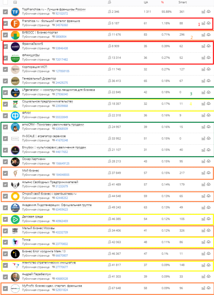 Список пабликов, выданный парсером. Выделены сообщества с одинаковыми тематиками: красные – тематические сообщества по франшизам, оранжевые – бизнес-сообщества, желтые – предпринимательство, зеленые – сервисы для бизнеса