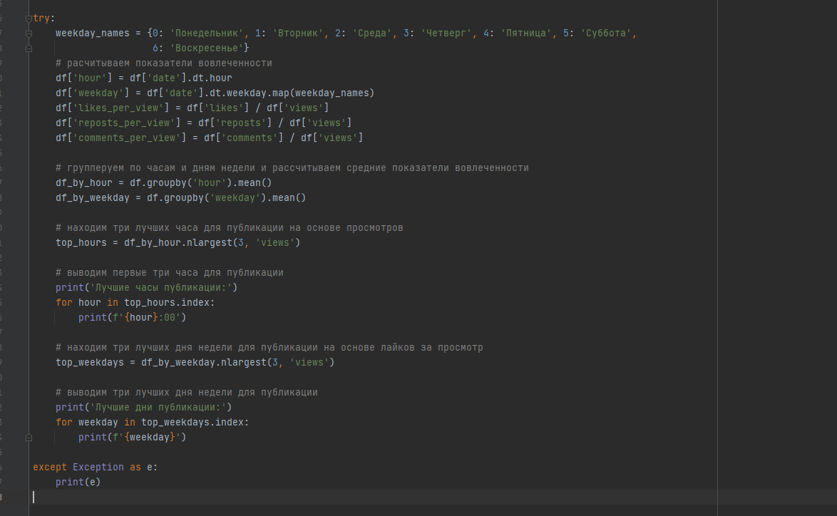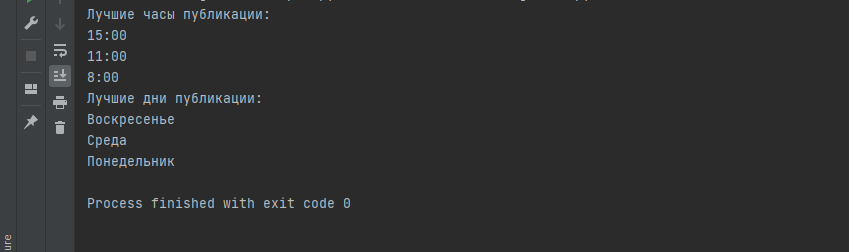 Затем я сгруппировал эти данные по часам и дням недели и рассчитал средние показатели вовлеченности для каждого интервала. На основе полученных данных я нашел лучшие часы и дни для публикации своих постов.