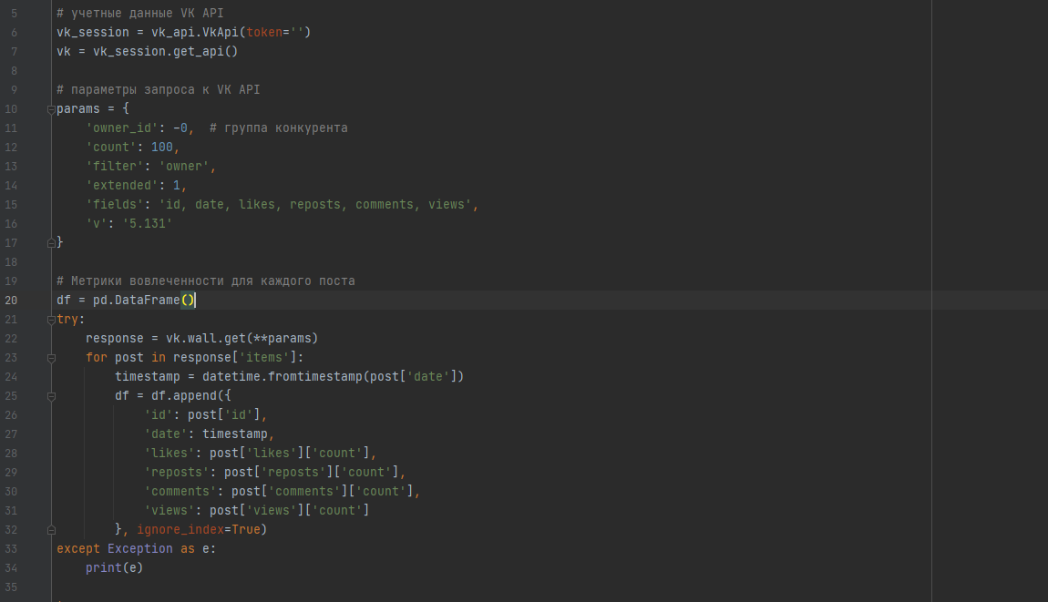 Однажды я задумался, в какое время лучше выкладывать посты в ВКонтакте для моей целевой аудитории. Поразмыслив, я решил вооружиться Python и VK API и написать свой собственный скрипт, который по ID группы конкурента получает метрики вовлеченности для каждого поста в выбранном периоде времени: ID поста, дата, количество лайков, репостов, комментариев, просмотров.