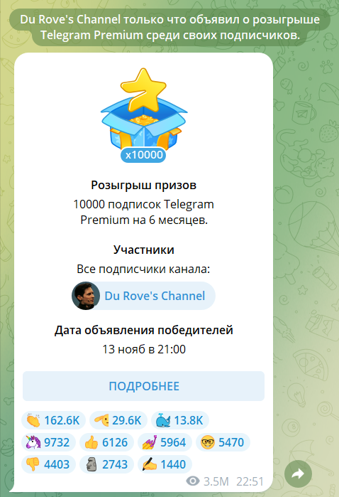 Первый в своем роде розыгрыш Premium-подписок в канале основателя Telegram Павла Дурова.