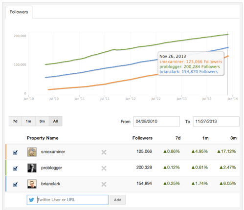 Чтобы получить быстрый сравнительный анализ аудитории компании в соцсетях и ее конкурентов, можно использовать бесплатный инструмент от Wildfire – он не только позволяет сравнить текущую аудиторию соцстраницы, но и скорость ее роста за последнее время.