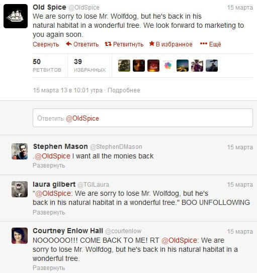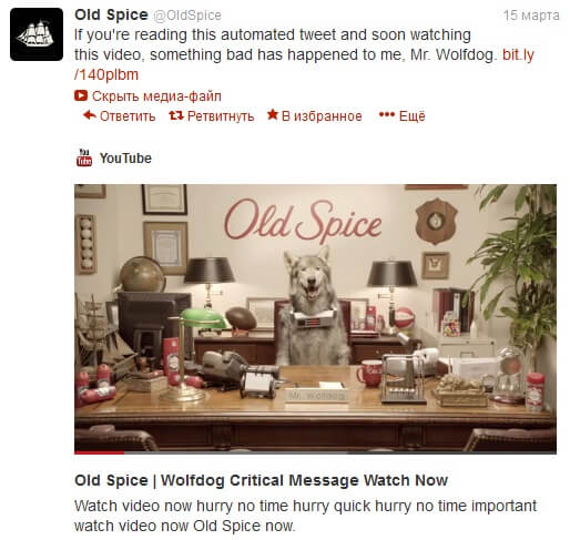 Тот, кто хоть раз видел ролики Old Spice, не забудет их никогда. Бренд также ведет активную жизнь в социальных сетях и не боится экспериментов. Например, не так давно компания передала свой Twitter-аккаунт своему новому директору по маркетингу Мистеру Волкодаву (Mr. Wolfdog).