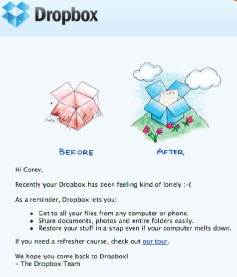 Если вы хотите, чтобы ваши электронные письма читали, исключите скучный контент. Бренд рассылает короткие персональные сообщения, написанные языком, понятным обычному покупателю. Рассылка сопровождается изображениями. Как тут не загрустить вместе с Dropbox из-за того, что вы его не используете. И заметьте, в письме есть смайлик.