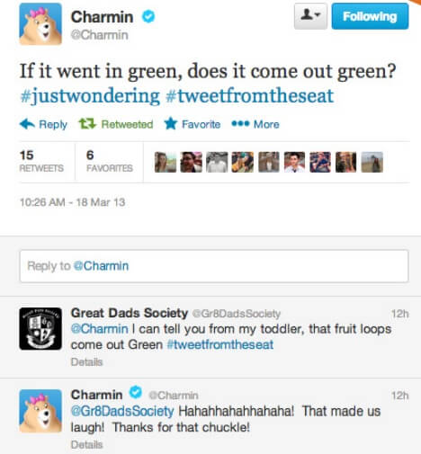 Относиться с юмором к своей продукции – вот девиз бренда Charmin, неоднократно упоминавшегося на нашем сайте. Все посты одного из крупнейших производителей туалетной бумаги в США представляют из себя нескончаемый поток юмора и развлечений. Что только стоит их хэштег «tweetfromtheseat», который наводит на мысль, что вы пишете в Twitter, сидя в туалете.