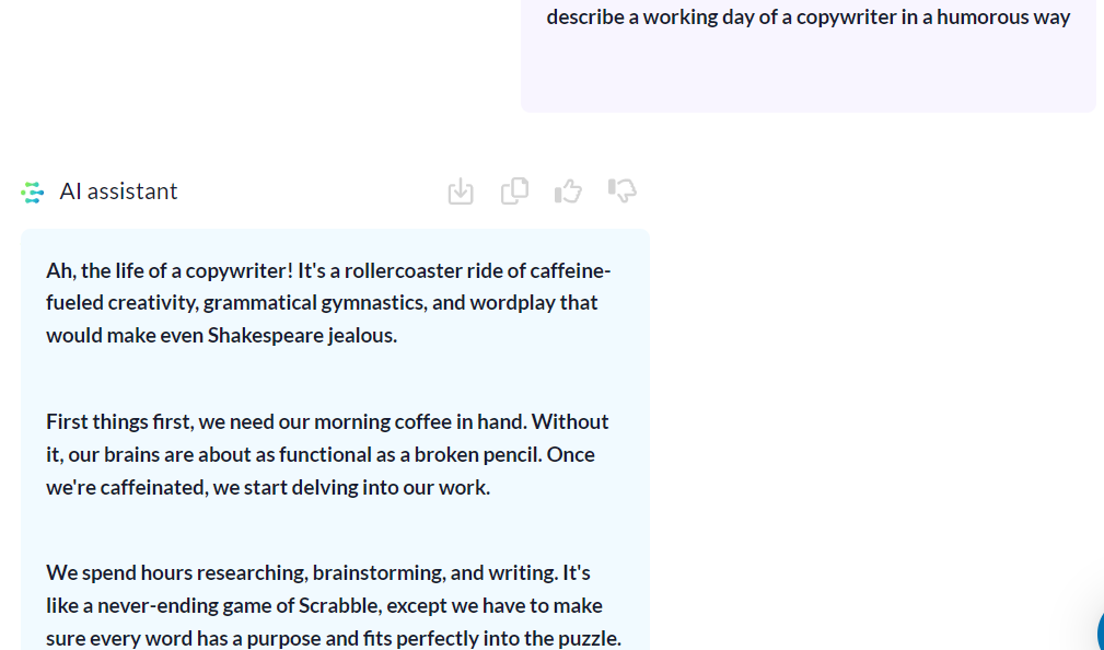 А ранее упомянутая ChatGPT любезно предоставила нам описание дня копирайтера. Даже нейросеть знает, что контент-мейкер живет в основном благодаря кофеину.