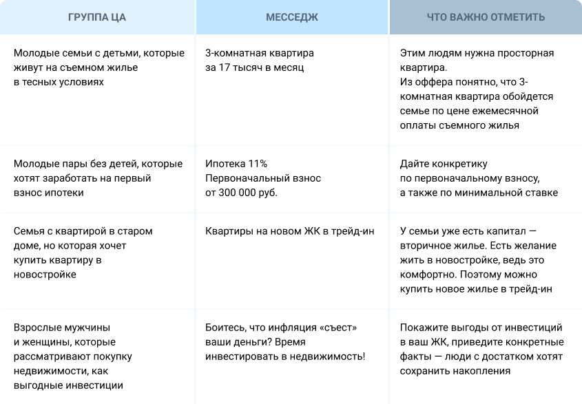 Мы много лет работаем с застройщиками, и такое правило еще ни разу не подвело. Для первоначального теста соберите 3-7 групп целевой аудитории и подготовьте для каждой из них ценностное предложение.