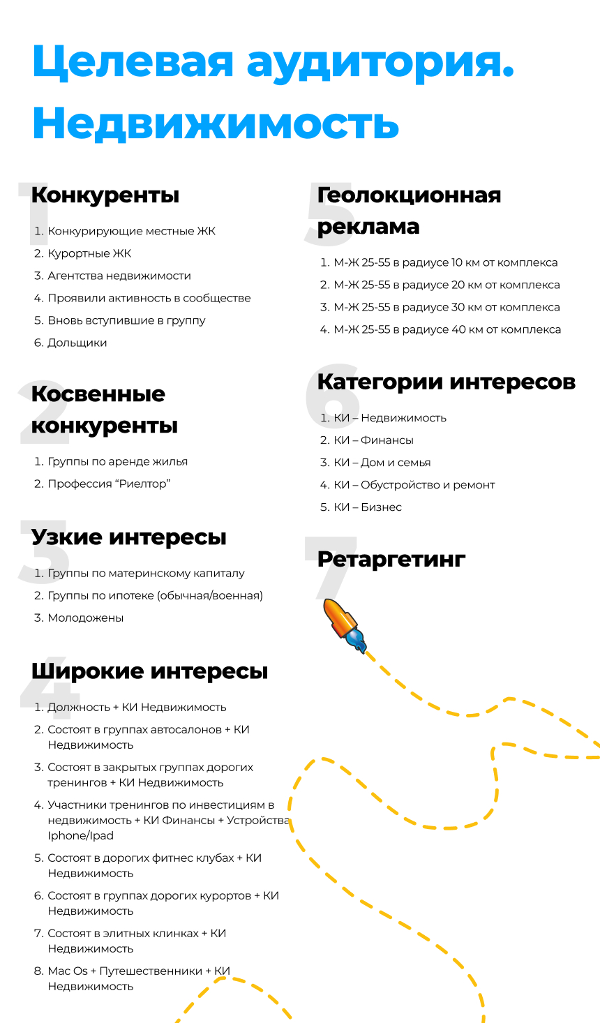 премиальная недвижимость → ориентируйтесь на аудиторию дорогих фитнес-клубов и курортов.