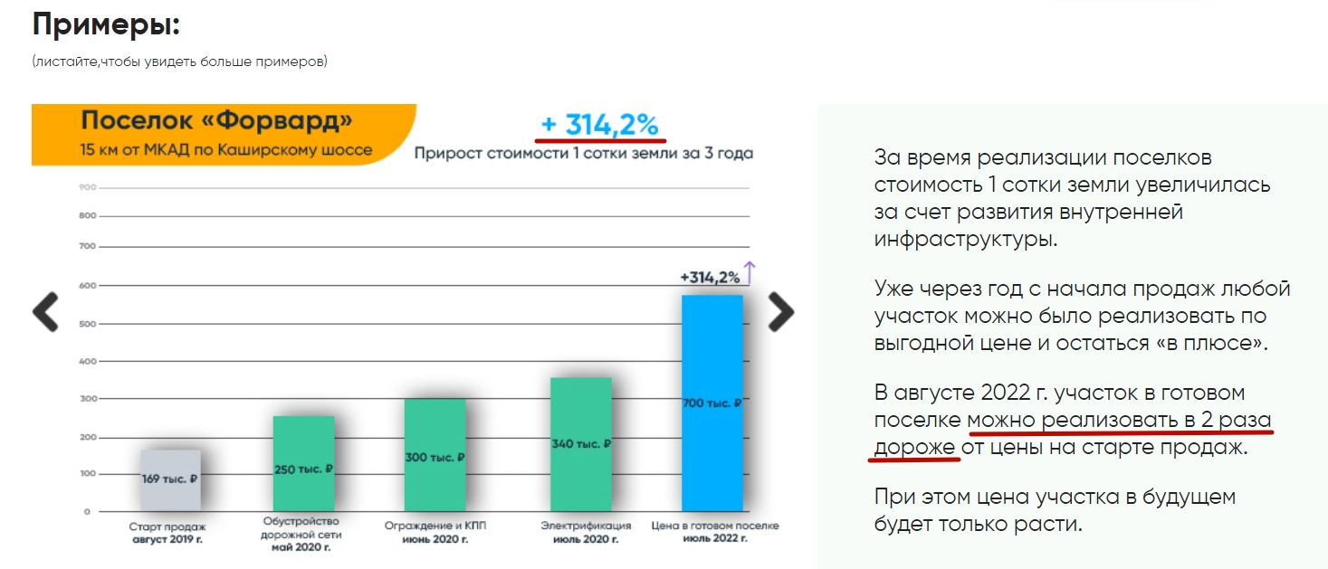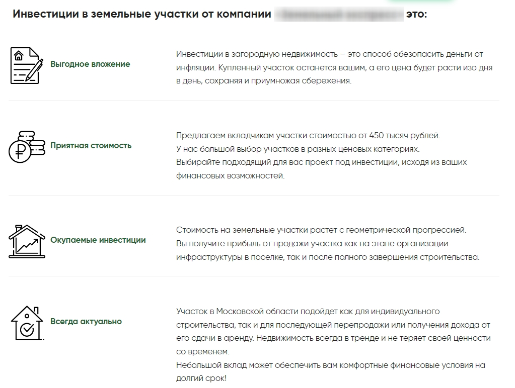 На посадочной странице привели также конкретные доказательства, почему инвестиции выгодны. Это убеждает в целесообразности покупки участка.