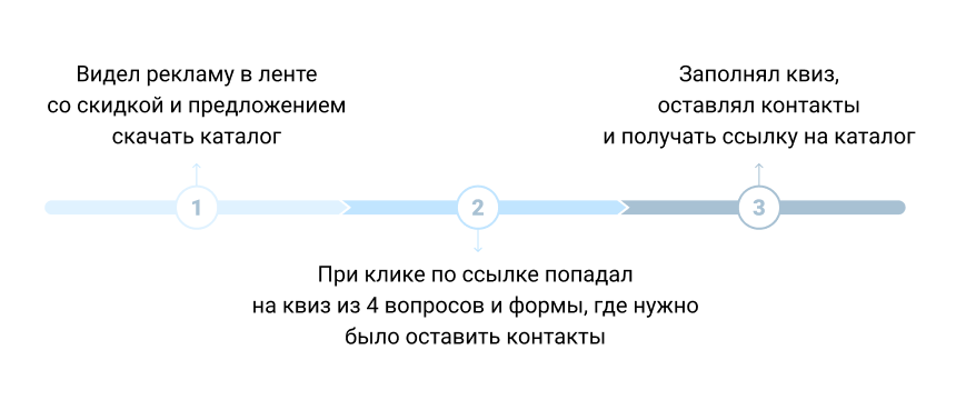 Процесс взаимодействия пользователя ВК с объявлением, где зашит квиз, можно изобразить в виде следующей схемы: