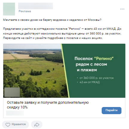 На проекте по продвижению коттеджного поселка мы выбрали наиболее привлекательное изображение природы с полями и массивным лесом. В тексте объявления сделали акцент на близости к лесу и пляжу, указав при этом на малую отдаленность от МКАД.