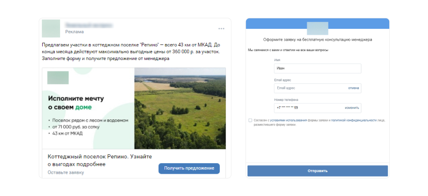 Креатив с упрощенной лид-формой на проекте по продвижению земельных участков