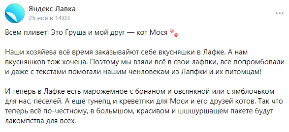 В качестве примера – кейс Яндекс Лавки, которая выпустила пост от имени питомцев. Ошибки, опечатки и ломаный язык стали фирменной фишкой, вызвали умиление и собрали массу реакций под публикацией.