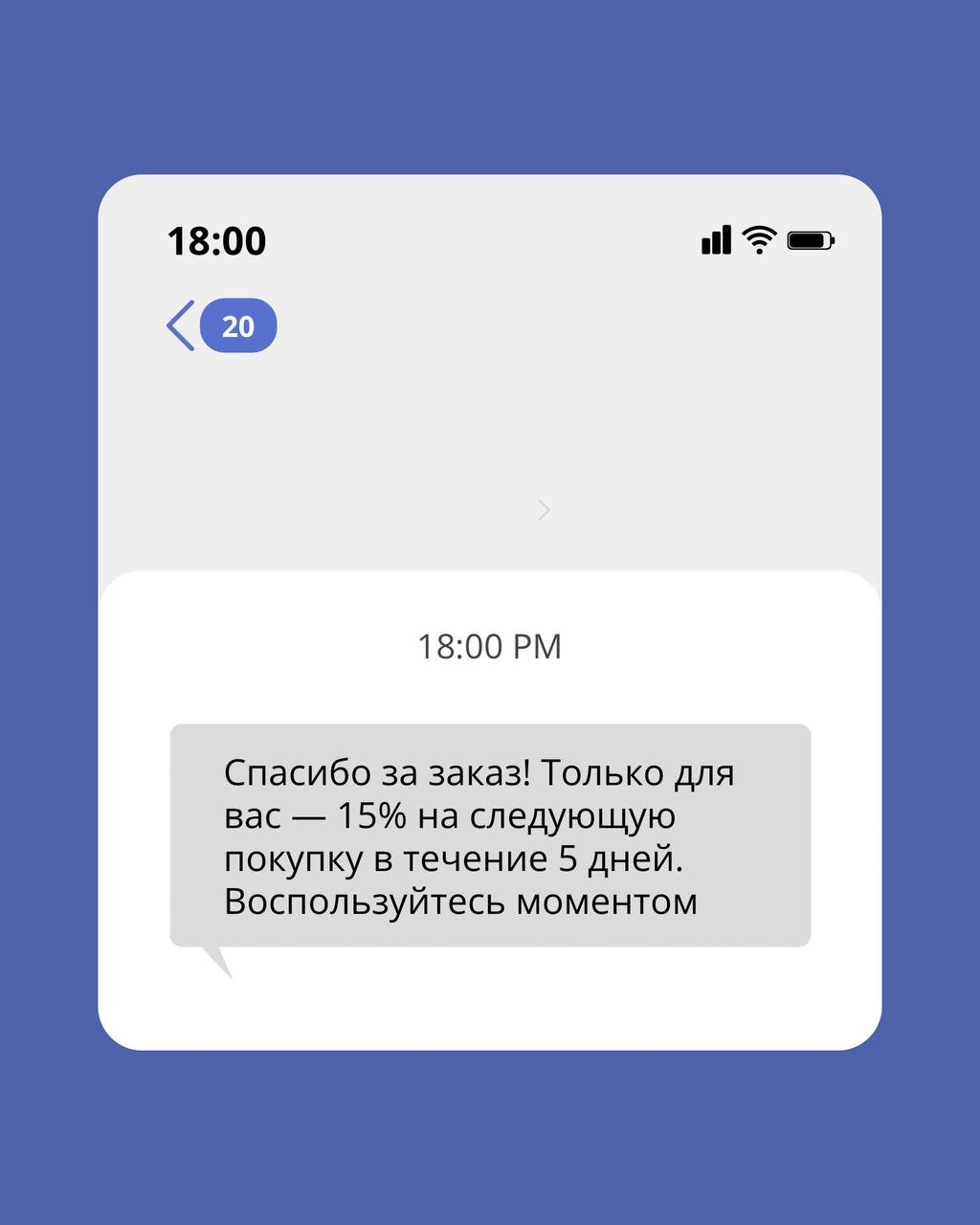 Пример: «Спасибо за покупку! В течение 5 дней для вас действует скидка 15% на следующую. Успейте воспользоваться: ссылка»