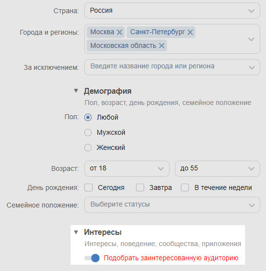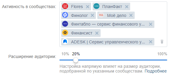 Настройка «Расширение аудитории» помогает привлечь пользователей, подписанных на конкурентов или тематические сообщества, например, паблик рыболовов, если вы продаете товары для рыбалки.