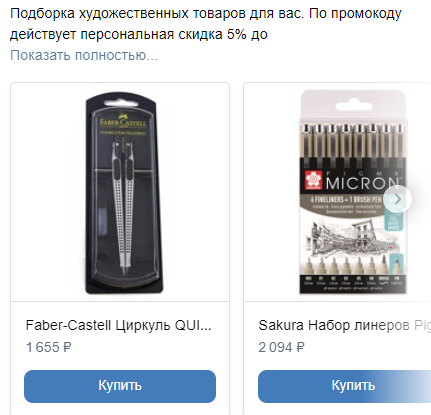 ВКонтакте этот алгоритм можно использовать для привлечения новых клиентов. Он покажет наиболее релевантные товары с вашего сайта даже тем, кто никогда на нем не был. Карусель формируется автоматически на основе фида данных.