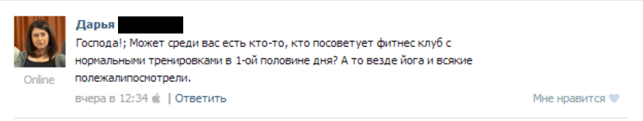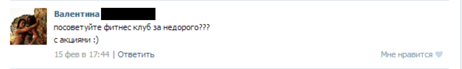 1. Реклама для «горячих лидов»: здесь, прямо сейчас, и только то, что им нужно! Инсайты ваших клиентов лежат на поверхности. Они уже разместили пост с просьбой подсказать наилучший вариант для посещения, скажем, фитнес-клуба, они прописали свои требования, они уже готовы купить абонемент, который им посоветуют другие. Так будьте на шаг впереди ваших конкурентов, ожиданий аудитории, и даже пожеланий самого пользователя. Идите на опережение и удивляйте!