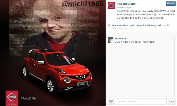 Еще один кейс с персонализированными изображениями. Nissan использовал Twitter и Instagram для поощрения подписчиков посредством оригинальных фото. Ну и заодно удалось отлично прорекламировать новую модель Juke.
