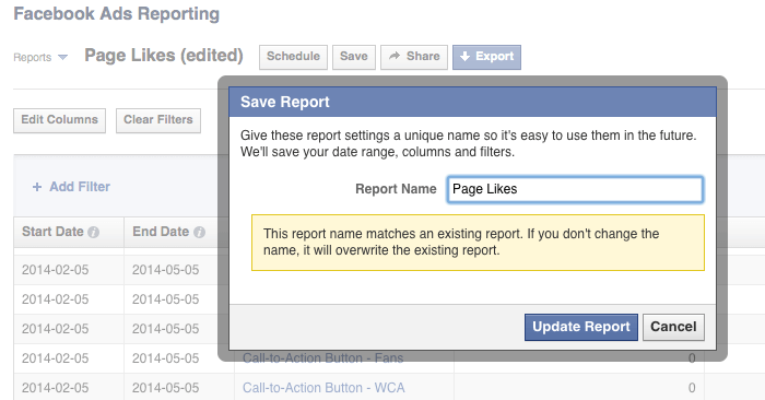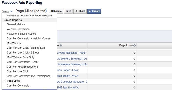 Каждый раз, когда вы будете возвращаться к вашим отчётам, Facebook будет показывать вам отчёт по умолчанию. Сохраненные отчёты будут доступны в выпадающем меню.