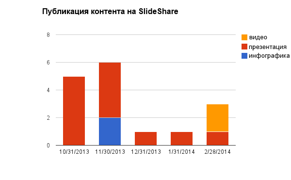 В течение четырёх месяцев (начиная с сентября 2013 г.) почти каждую неделю в профиле сервиса Scoopit на SlideShare выходила новая публикация. За весь экспериментальный период было размещено 12 презентаций, 2 инфографики, 2 видео. Весь контент (кроме видео) создавался силами сотрудников сервиса.
