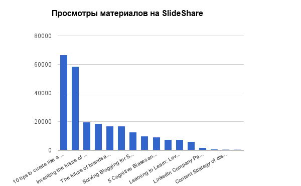 - хиты: 2 презентации получили почти 60 тыс. просмотров, то есть принесли 50% трафика (одна из них была оригинальной, другая – переделанный специально для SlideShare пост из блога);