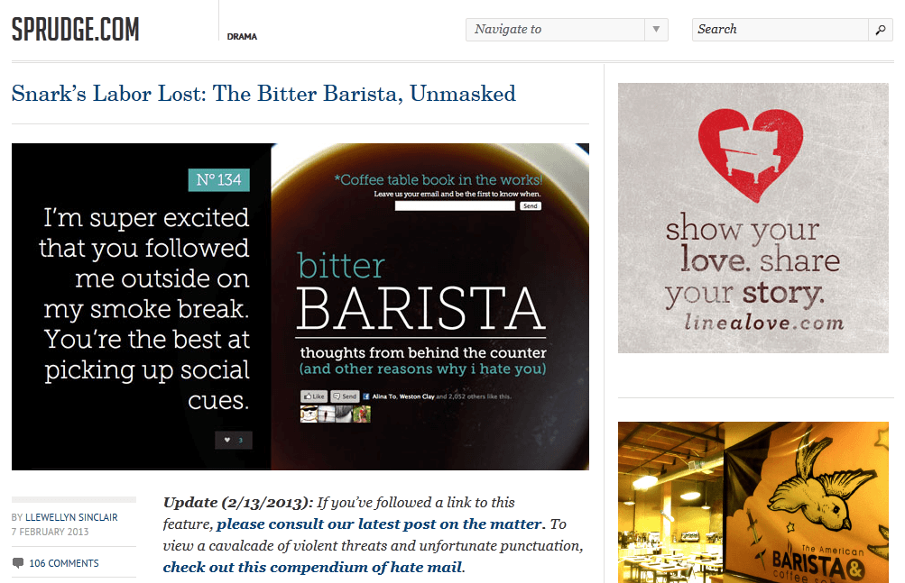 Мэтт, в свободное от работы время, читал рэп, используя псевдоним Speculation. Именно это обстоятельство и позволило ресурсу Sprunge, целиком и полностью посвященному кофе и кофейному бизнесу, разрушить чары анонимности. После того, как личность была установлена, сотрудники Sprunge сочли необходимым опубликовать разоблачение, так как посчитали, что шуточная хроника рабочих будней «горького баристы» превратилась в сплошные нападки буквально на всех, кто заходит к нему в кофе-хаус. Оставим это замечание на совести Sprunge, так как содержимое блога вовсе не кажется нападками. Злой и едкой сатирой – пожалуй, порою, но не более.