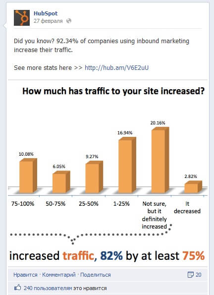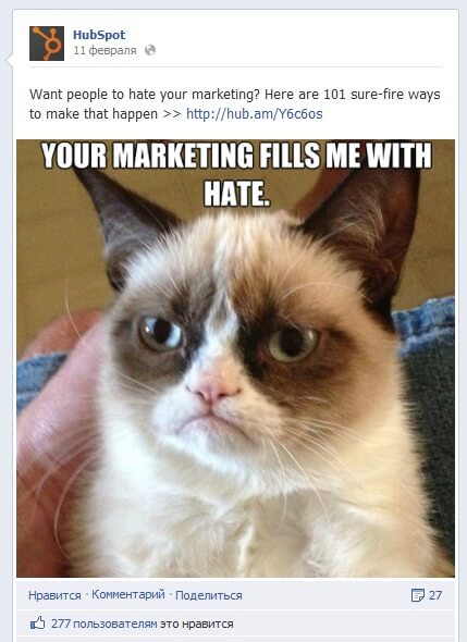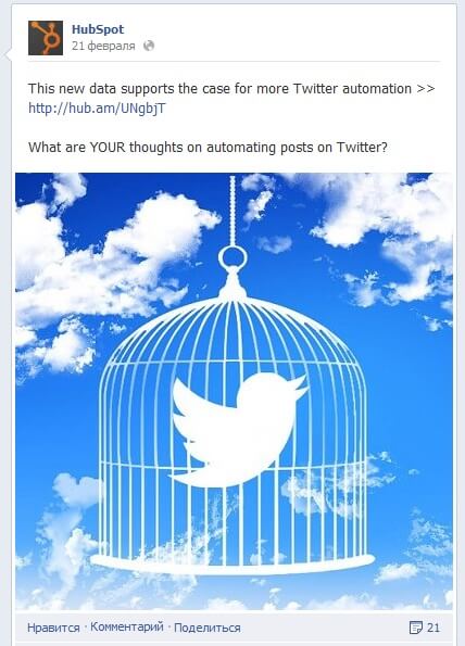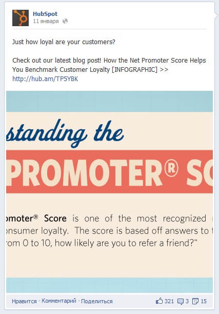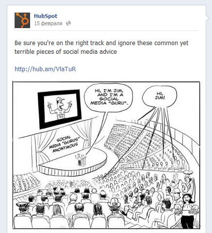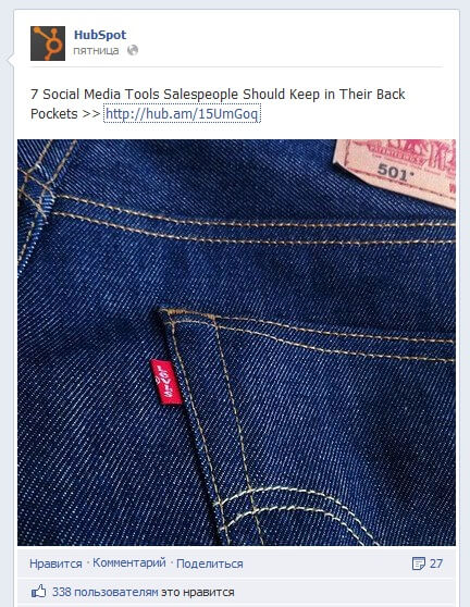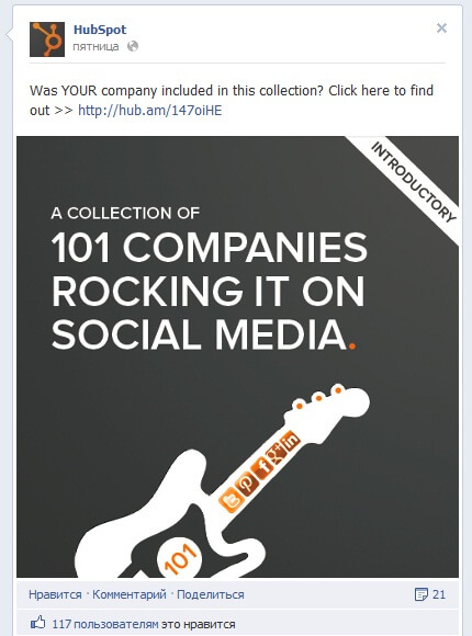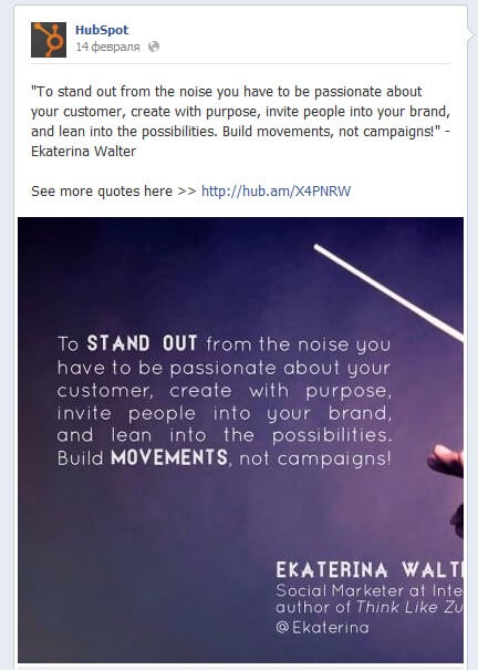 По словам Бриттани Лининг (Brittany Leaning), SMM-специалиста HubSpot, в прошлом году компания решила размещать больше изображений в социальных сетях, так как пользователи охотнее делятся картинками. Сейчас 75% постов компании – это изображения, которые сопровождаются короткими ссылками, ведущими на сайт.