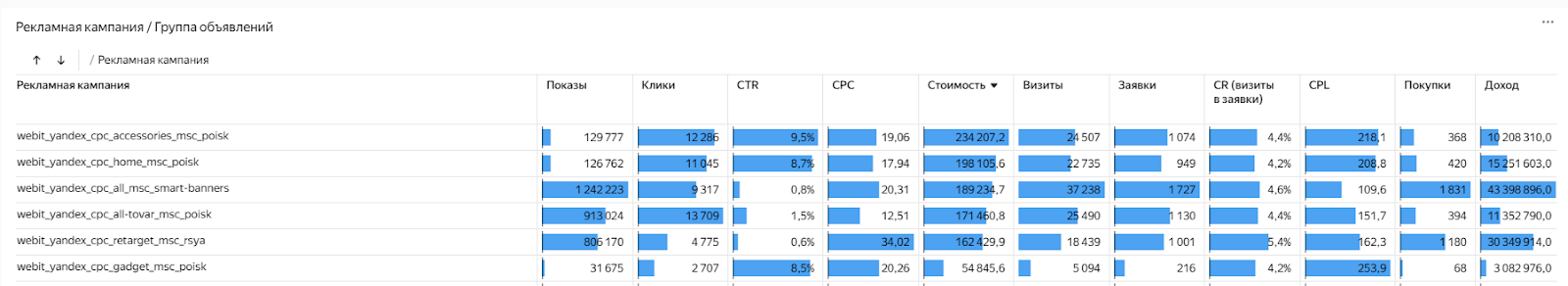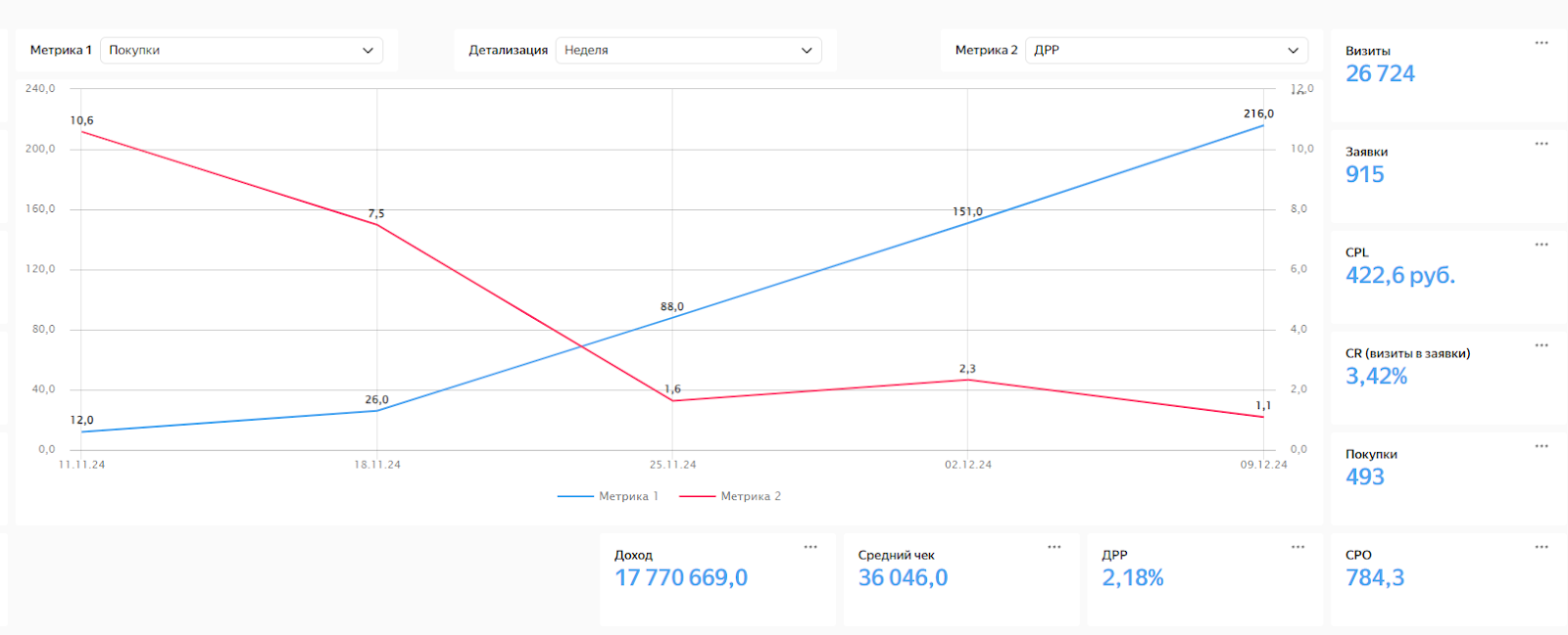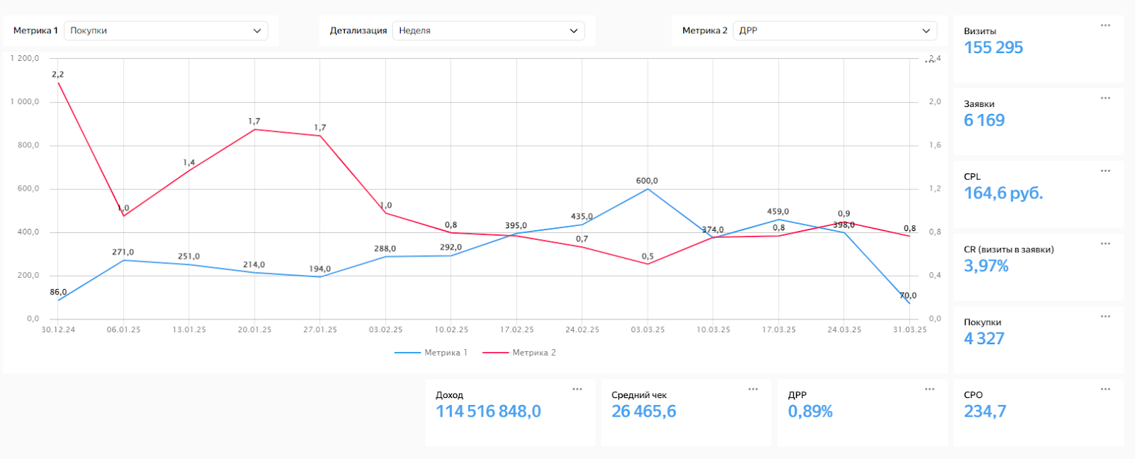 Для удобства отслеживания ключевых показателей мы настроили дашборд в DataLens, который включал метрики по трафику, конверсиям, CPL, доходу и ДРР. Так мы смогли оперативно отслеживать эффективность кампаний и принимать решения на основе актуальных данных.