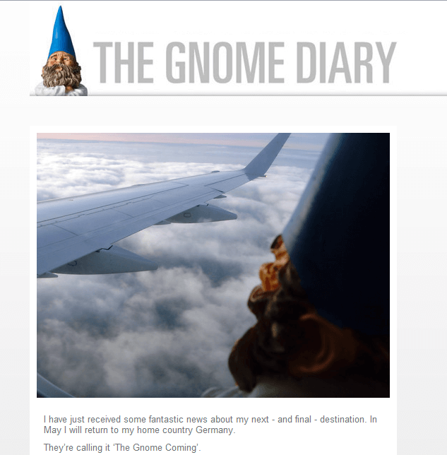 Путешествие гнома заняло больше года. За это время он успел побывать и на Южном Полюсе, и в лаборатории ЦЕРН. От лица гнома велся и , где выкладывались фотографии мест, где он побывал и впечатления от увиденного.