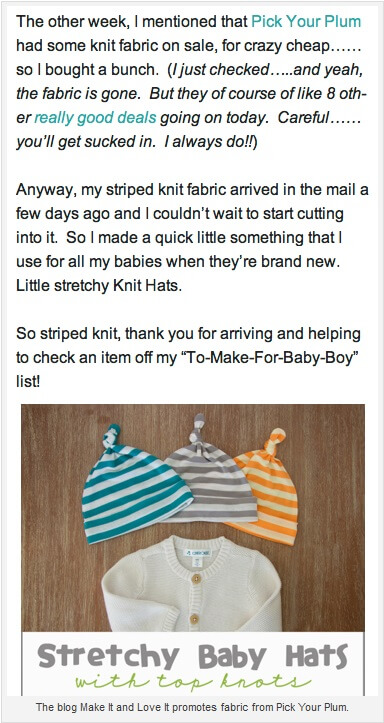 В тот день, когда мы продаем нитки, ткань, или кнопки, мы размещаем пост на Facebook и делаем его новостью дня. А пару часов спустя мы выкладываем еще один пост, примерно такого содержания: «Заглядывали на Make It and Love It? Там вы найдете бесплатные выкройки, которые могут очень вам пригодиться!» Таким образом, мы увеличиваем их трафик. А объявления о наших товарах, в свою очередь, появятся у них на сайте».