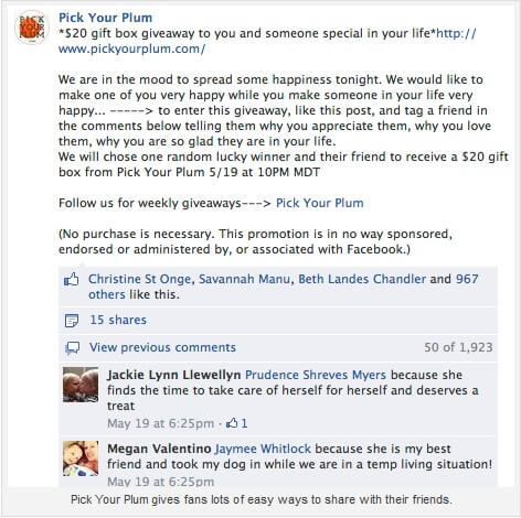 Pick Your Plum постоянно выкладывает информацию, которой подписчики могут и хотят делиться. Часто они устраиваю акции, в которых просят фолловеров привлекать своих друзей к участию в них. Победитель и его друг получают призы. Принс утверждает, что количество лайков в Facebook всегда увеличивается во время таких акций.