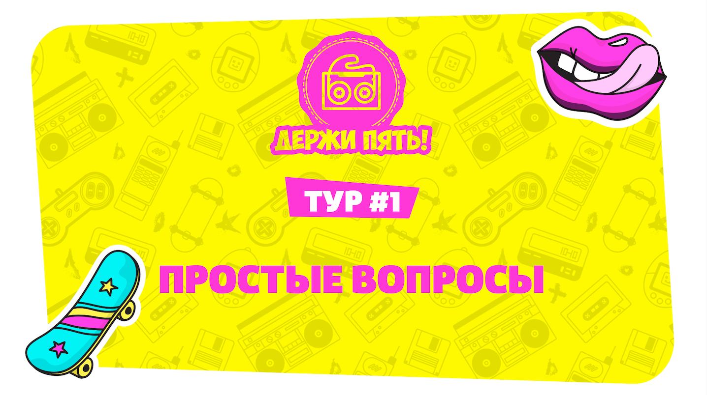 У ребят из квиза «Держи Пять!» еще не было опыта ни в переводе игр в онлайн, ни в создании визуальной концепции по высоким (да, занудным) требованиям, а сроки поджимали. Поэтому мы со своей стороны на коленке сами придумали название и логотип. Все остальное визуальное наполнение накидали по остаточному принципу за несколько дней. Не совсем наша стилистика, не очень современно, но мы решили, что для теста «пойдет».
