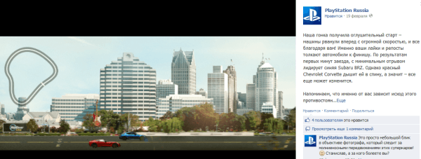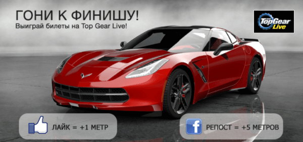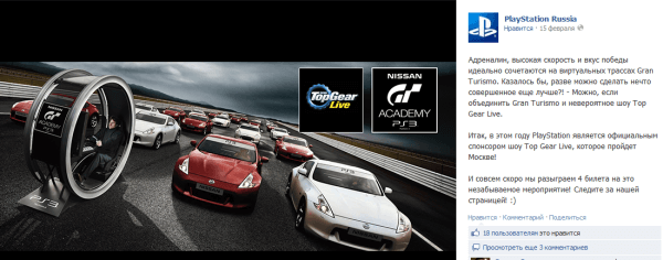В преддверии февральского шоу Top Gear Live, которое проходило в Москве, PlayStation, официальный спонсор мероприятия, предложила устроить своим Facebook-подписчикам сумасшедший заезд прямо на своей странице. А заодно выиграть билеты на шоу.