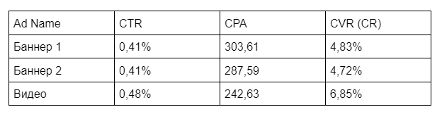 По итогам запуска свели в общую таблицу данные по всем трем креативам, которые были нами использованы. Результаты еще раз подтвердили, что TikTok больше «заточен» под видеоконтент, и наш видеоролик по всем показателям показал наилучший результат: