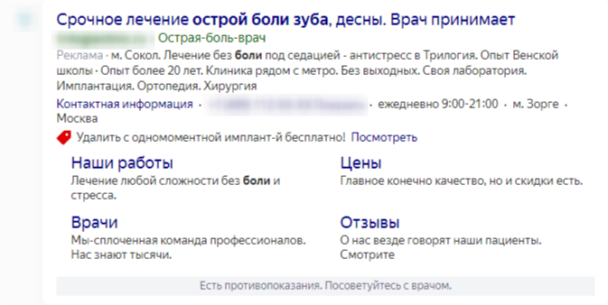 Чтобы рекламный блок не выделялся от органики, мы сделали заголовки в более официальном стиле. Наподобие: «Городская стоматология – Санкт-Петербург, м. Фрунзенская». На заголовки такого плана кликают чаще, потому что пользователь не воспринимает их, как рекламную выдачу.