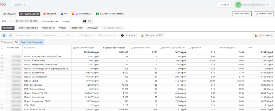 Мы начали работать с центром флебологии с конца сентября 2022 года. Наш клиент уже вел самостоятельно рекламные кампании, но не комплексно – на момент начала работы присутствовали автоматические цели «Клик по номеру телефона» и «Отправка форм» без учета корректности заполнения данных.