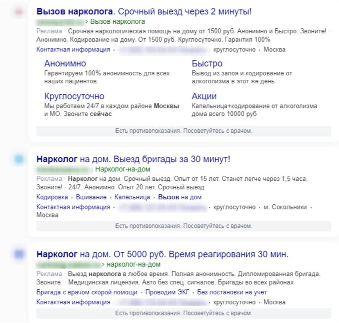 Время принятия решения разное для каждого меднаправления. Для услуг, где нужна неотложная помощь, в выдаче будет работать только первое место и с возможностью быстрого выезда на дом в любое время суток – никто не будет открывать объявления и читать преимущества на посадочной странице.
