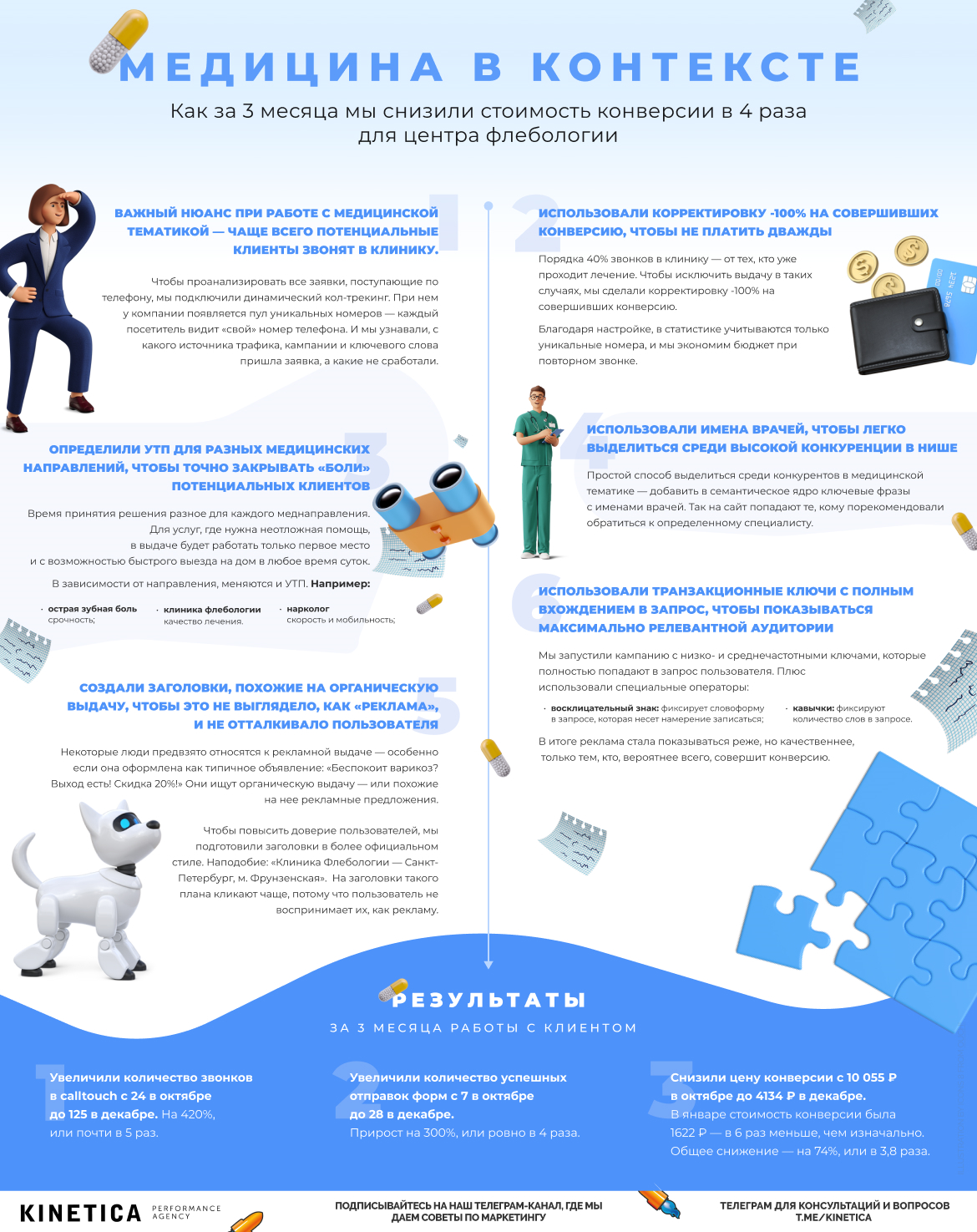 В статье мы рассказали, на что можно обратить внимание при настройке контекстной рекламы в медицинской сфере. Но это лишь один пример: способов может быть еще больше. Главное – не бояться экспериментировать и выходить за рамки привычного.