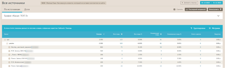 Данные о звонках с динамического колл-трекинга в разрезе Источника трафика и Рекламных кампаний