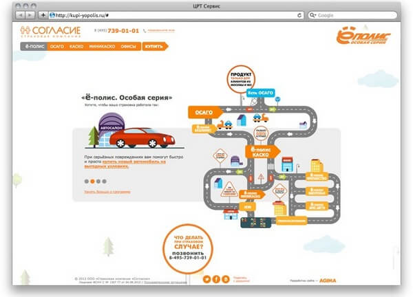 Осторожнее на виражах — смотрите по сторонам и не забывайте про знаки! Схема продаж в виде реальной дороги визуализирована на главной странице сайта. Roadmap отражает логику продажи продуктов в компании «Согласие». Если у вас есть ОСАГО, не тратьте время и двигайтесь направо, чтобы оформить «ё-полис. КАСКО», а если нет, выбирайте поворот налево. Для тех, кто уверенно чувствует себя в пути, предусмотрена защита от аварии по чужой вине — «ё-полис. МИНИКАСКО».