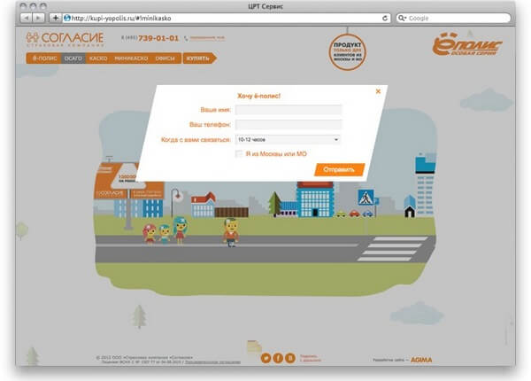 Перед интерактивным агентством AGIMA стояла задача разработать сайт в рамках рекламной кампании СК «Согласие». В основе всех коммуникаций находился сайт kupi-yopolis.ru. Его главная цель — лидогенерация и конверсия лидов в реальные заявки вовлеченных в страховую программу пользователей.