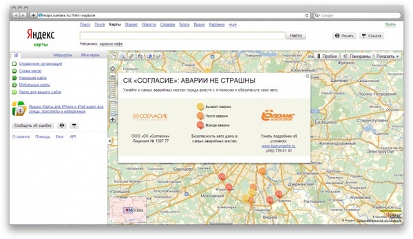 Рекламная кампания имела мощную оффлайн поддержку. Например, точки для размещения наружной рекламы определялись по GRP и в местах основных пробок Москвы. Но главным каналом продвижения оставался интернет: контекстная реклама на популярных автомобильных порталах, продвижение в социальных сетях и проект «Карта страховых случаев» — специальный рекламный слой на Яндекс.Картах.