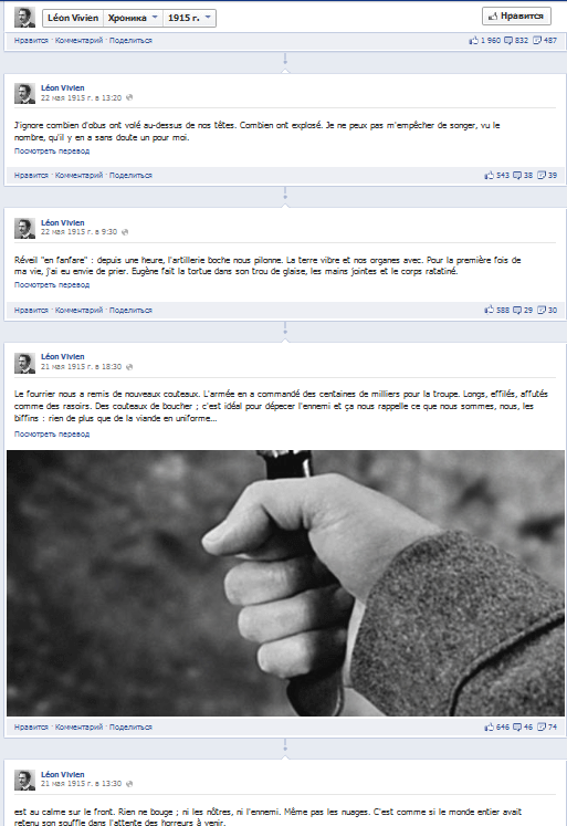 Последний пост Леона, датированный 22 мая 1915 года, собрал 1 960 лайков, 487 расшариваний и 832 комментария. Немногие из ныне живущих пользователей Фэйсбук, если только они не рок-звезды, могут похвастаться таким вовлечением аудитории.