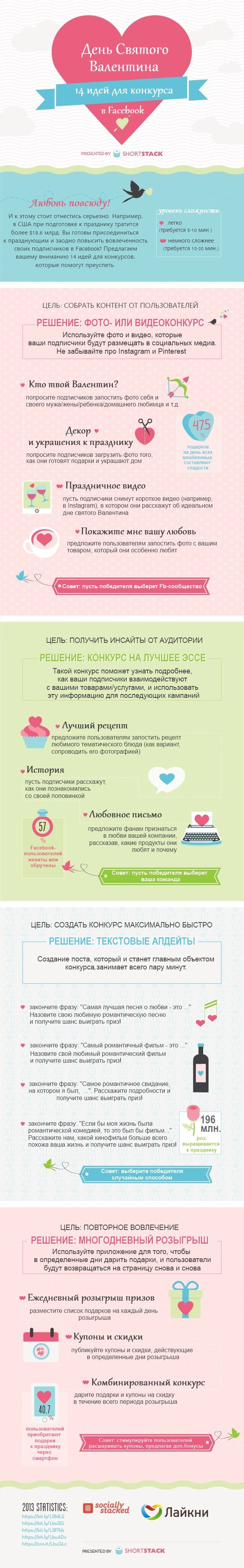 Если вы не успели подготовиться ко Дню всех влюбленных заранее, не все потеряно – в последнюю минуту можно придумать несколько способов, как развлечь своих подписчиков. Предлагаем вашему вниманию 14 идей для конкурсов в Facebook, которые можно провести в праздник или за несколько дней до него.