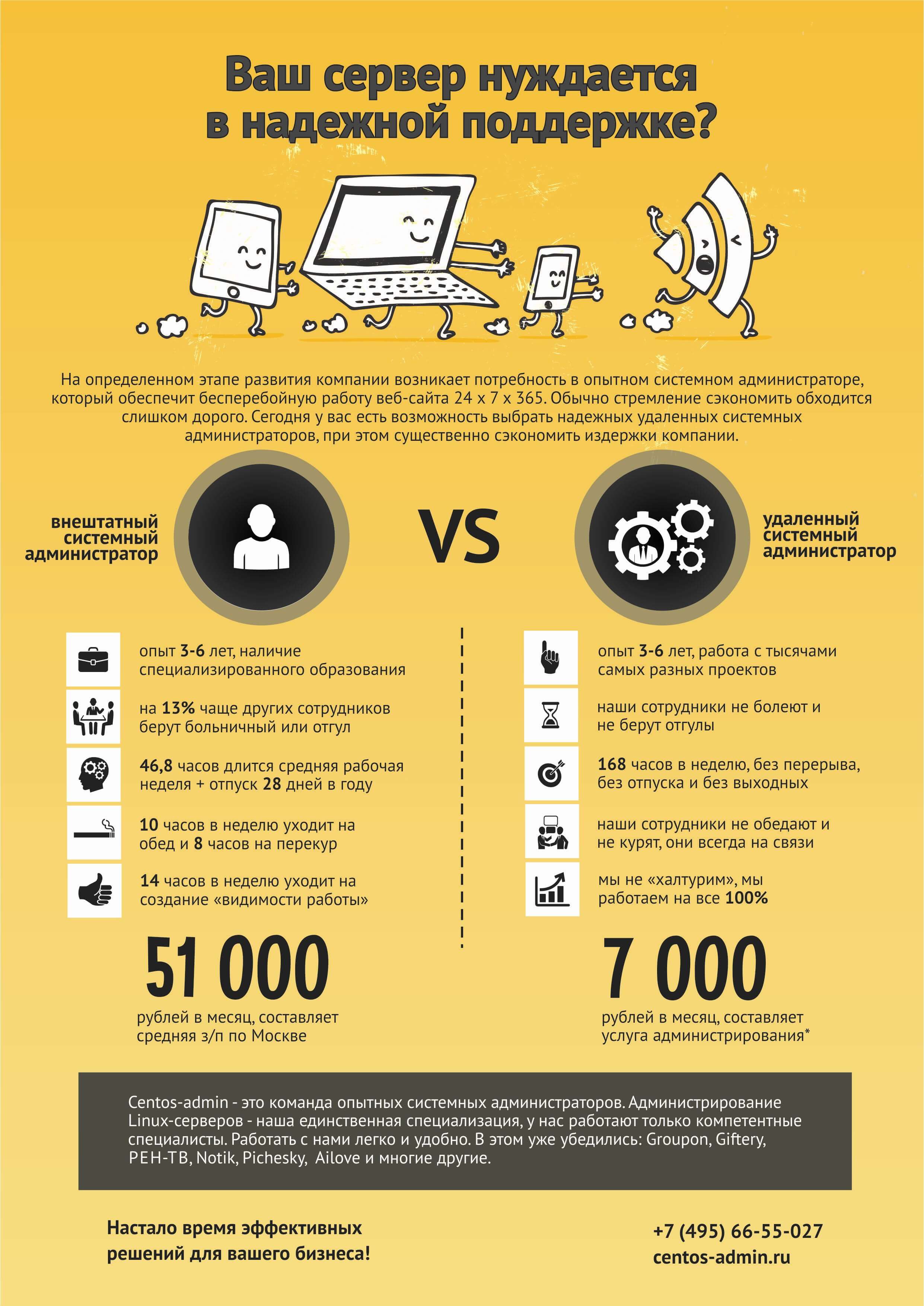 Грамотный сисадмин в штате, вне всяких сомнений, потребует достойную заработную плату (по последним данным от 70 000 рублей). В Centos-admin.ru стоимость поддержки одного сервера компании – 7 000 рублей в месяц. В стоимость администрирования входят настройка и обслуживание типового серверного программного обеспечения, всевозможный мониторинг, удаленное резервное копирование.