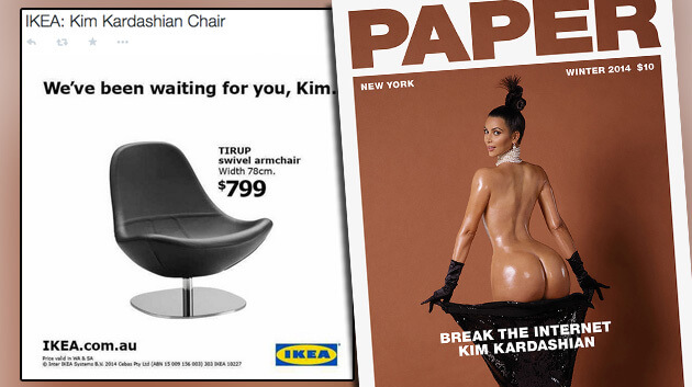 Пример. IKEA Australia сразу после выхода скандальной обложки журнала Paper с Ким Кардашьян опубликовала в социальных сетях этот пост, который мгновенно стал вирусным.