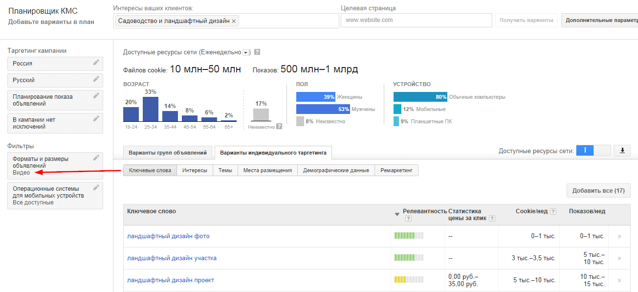 Чтобы подобрать ключевые слова, откройте Планировщик КМС, введите ключевое слово и нажмите на кнопку Получить варианты. Далее вы сможете посмотреть фразы для видео.