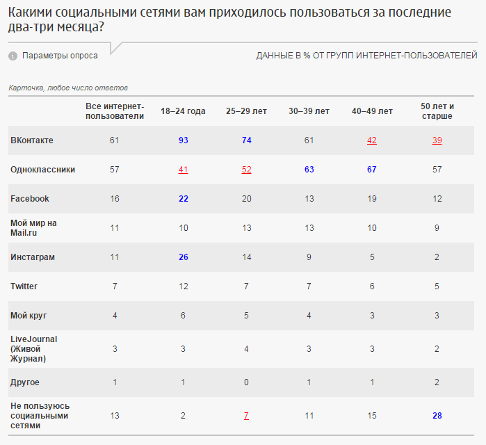 Как и ожидалось, самыми популярными площадками оказались ВКонтакте, Одноклассники и Facebook. К ним за последние три месяца обращались 61, 57 и 15% опрошенных пользователей соответственно. ВКонтакте оказалась и самой молодой соцсетью: 93% респондентов, указавших эту соцсеть, относятся к группе 18–24 года; у Одноклассников к этой категории относится всего 41%, их чаще упоминали люди в возрасте 40–49 лет (67%).